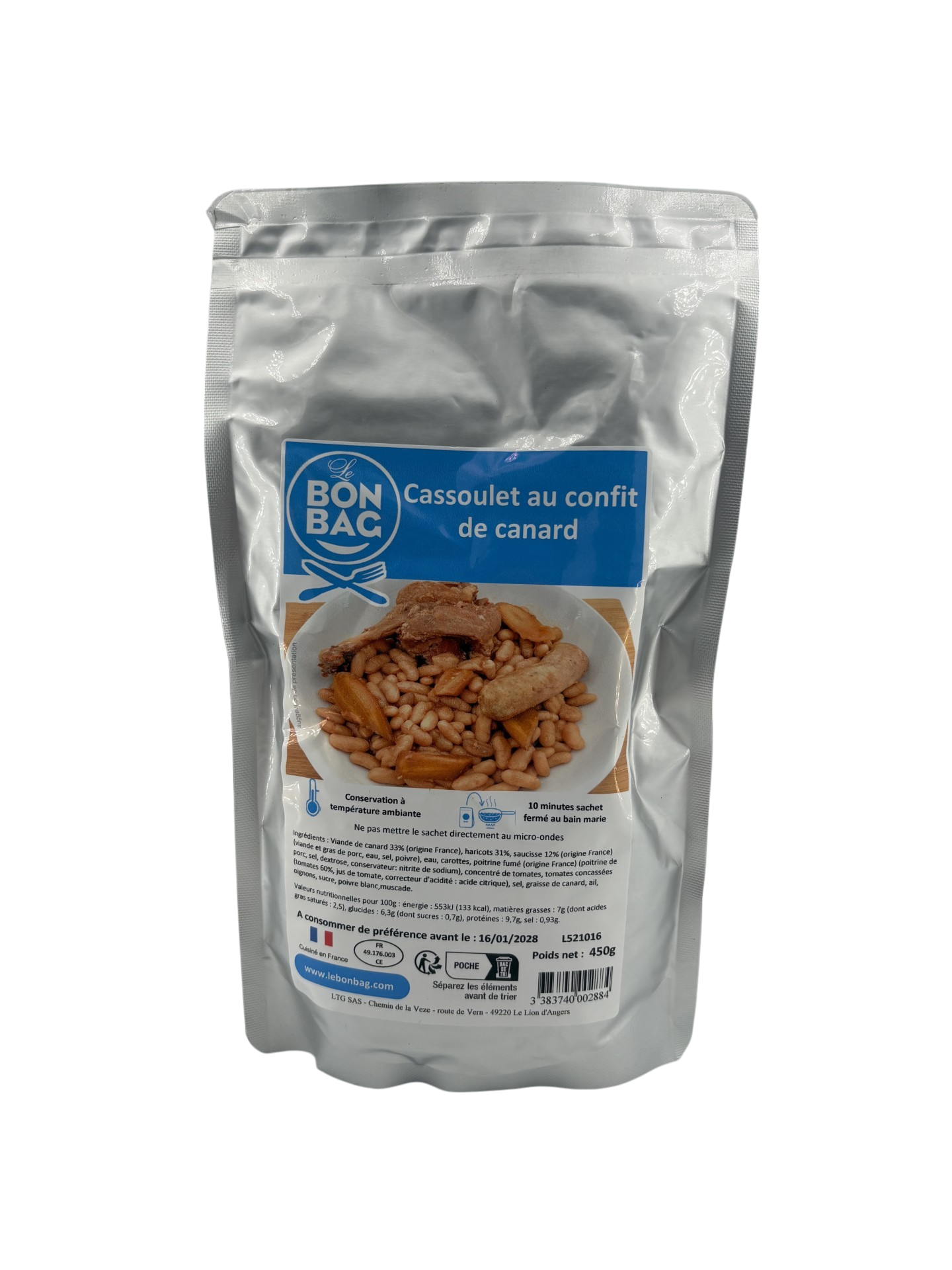Viande de canard 33% (origine France), haricots 31%, saucisse 12% (origine France) (viande et gras de porc, eau, sel, poivre), eau, carottes, poitrine fumé (origine France) (poitrine de porc, sel, dextrose, conservateur: nitrite de sodium), concentré de tomates, tomates concassées (tomates, jus de tomate, correcteur d’acidité : acide citrique), sel, graisse de canard, ail, oignons, sucre, poivre blanc, muscade.